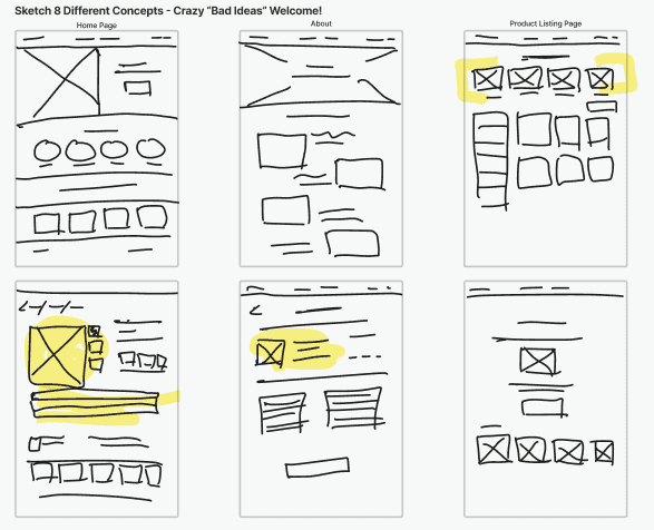 Evolving early concepts into wireframes that clarified hierarchy, product detail, and checkout confidence.